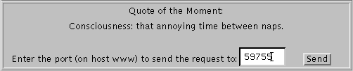 Before the applet can get quotes, you need to run the server on the host that the applet came from. You then need to note the number of the port that the server is listening on. After you enter this port number into the applet, it'll hook up with the server and you'll be able to get one-line quotations. Below are detailed instructions, followed by pictures of the server and the applet in action.