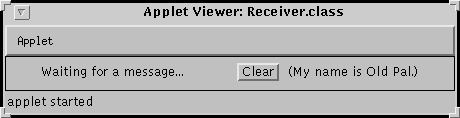 Try this: Click the Send message button of the top applet (the Sender). Some status information will appear in the Sender's window, and the Receiver will confirm (with its own status string) that it received a message, After you've read the Receiver status string, press the Receiver's Clear button to reset the Receiver.