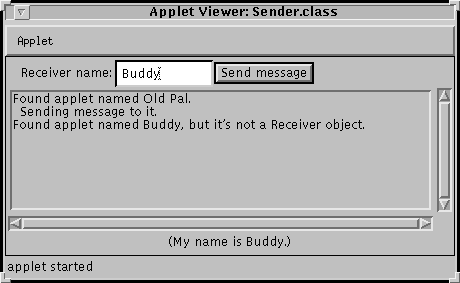 Below are two applets that illustrate lookup by name. The first, Sender, looks up the second, Receiver. When the Sender finds the Receiver, the Sender sends a message to the Receiver by invoking one of the Receiver's methods (passing the Sender's name as an argument). The Receiver reacts to this method call by changing its leftmost text string to "Received message from sender-name!".