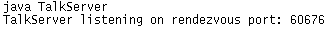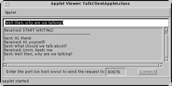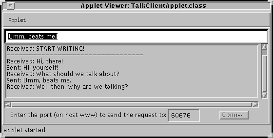 <applet code=TalkClientApplet.class width=550 height=200> </applet>Here's a link to a page that includes the above HTML code. After saving this page to a file on your local HTTP server, you can use it to communicate with the talk server