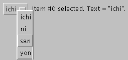 Below is the code that creates the Choice and handles events from it. (Here's the whole program.) Note that the second parameter to the action() method (which is the same as e.arg), is the string from the selected item.