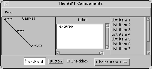 This page presented a whirlwind tour of the AWT components. Every component this page mentions is described in detail in Using Components, the GUI Building Blocks(in the Creating a User Interface trail).
